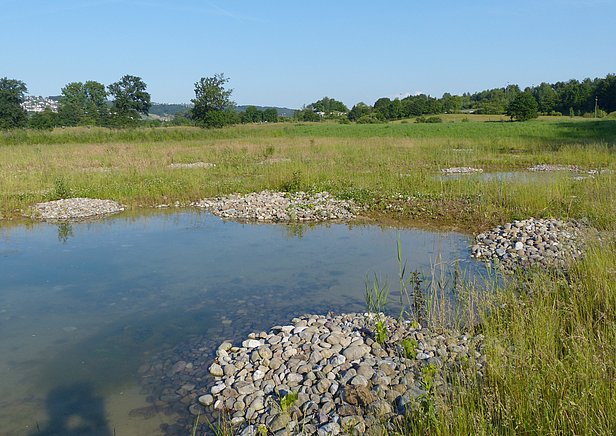 Wichtig für die lokale Biodiversität ist zudem, möglichst verschiedene Teichtypen zu bauen, permanent und temporär, von unterschiedlicher Grösse und in unterschiedlicher Umgebung. Eine vielfältige Landschaft fördert eine vielfältige Artenzusammensetzung und nicht zuletzt auch vielfältige Ökosystemfunktionen für Mensch und Umwelt.