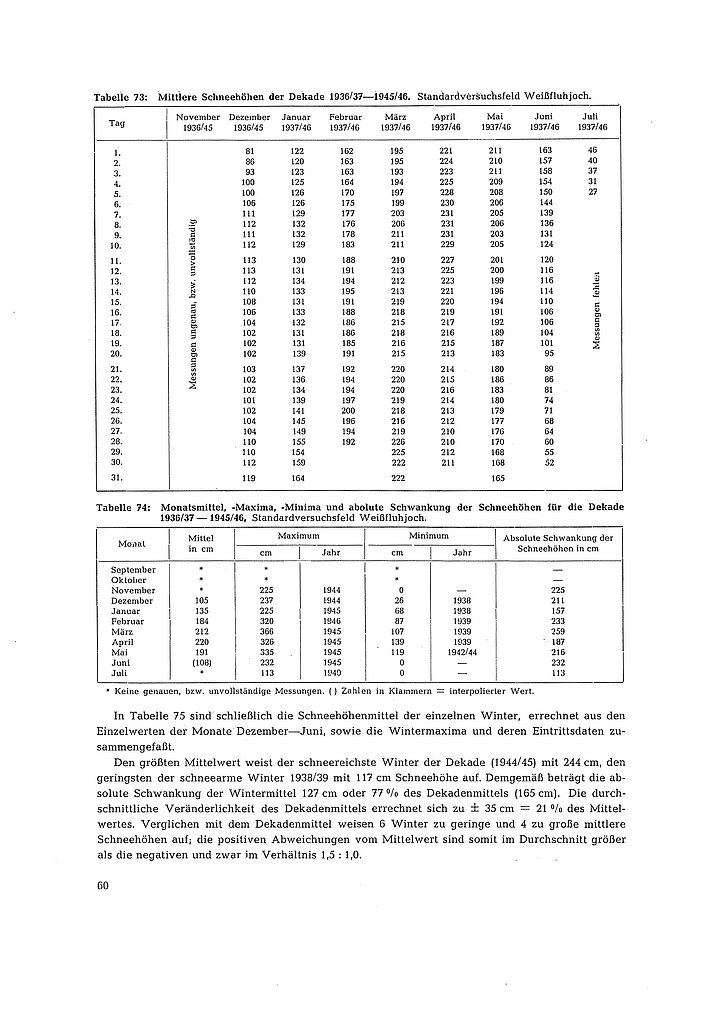 - Im Winter 1944/45 lag 9 Monate lang Schnee auf dem Versuchsfeld am Weissfluhjoch. Zitat aus der Zusammenfassung der Winterberichte 1936/37 bis 1945/46: «Der Winter 1944/45 war mit 295 Tagen permanenter Schneebedeckung, bei frühem Einschneien und spätem Ausapern, der längste und schneereichste der Dekade.» Am 9. März 1945 lagen 366 cm Schnee auf dem Versuchsfeld.