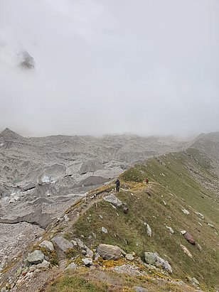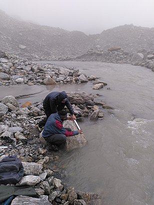 Kaum hatten wir unsere ersten Schritte auf dem Anmarsch gemacht, begann es zu regnen – ich fühlte mich an die Dezembertage bei meiner Grossmutter in der Picardie in Nordfrankreich erinnert. Dieses Jahr hatte der Monsun beschlossen, länger im oberen Alaknanda zu verweilen. Starker Regen und dichter Nebel begleiteten uns während der gesamten Reise. Einige Pläne mussten wir anpassen, im Grossen und Ganzen haben wir unsere Messungen aber wie geplant durchgeführt, angefangen mit der Installation einer Messstation im proglazialen Bach des Satopanth-Gletschers. Mit dieser wollen wir den Abfluss überwachen und mit den Daten das Schmelzmodell überprüfen, das wir in diesem Einzugsgebiet anwenden wollen.