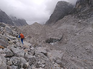 Easy? Das einzige Einfache ist, zu vergessen, wie schwierig es ist, auf einem schuttbedeckten Gletscher zu navigieren... Ein Auf und Ab über instabile Felsblöcke, riesige supraglaziale Seen, die den Weg versperren, wenn man es am wenigsten erwartet, übel aussehende Moränen, die den Durchgang blockieren ... Am Ende schafften wir es und konnten einige der historischen Bilder wiederholen. Diese werden helfen, die langfristigen Veränderungen dieser Gletscher zu rekonstruieren.