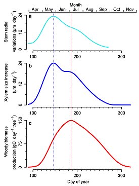 Cuny H. et al. (2015) Woody biomass production lags stem-girth increase by over one month in coniferous forests. Nature Plants. doi:10.1038/nplants.2015.160