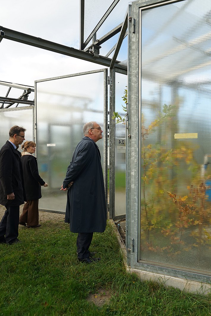 Guy Parmelin bei der Modellökosystem-Anlage. In diesen Glaskammern werden die Auswirkungen von Hitze und Bodentrockenheit auf Waldbäume untersucht. Im Hintergrund: Christoph Hegg und Charlotte Grossiord. (Foto: Tamara Baumann, WSL)