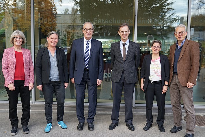 Bundesrat Guy Parmelin mit der Direktion der WSL. v.l.n.r.: Anna Hersperger, Birgit Ottmer, Guy Parmelin, Christoph Hegg, Anita Risch, Jürg Schweizer. Es fehlt: Thomas Wohlgemuth. (Foto: Tamara Baumann, WSL)