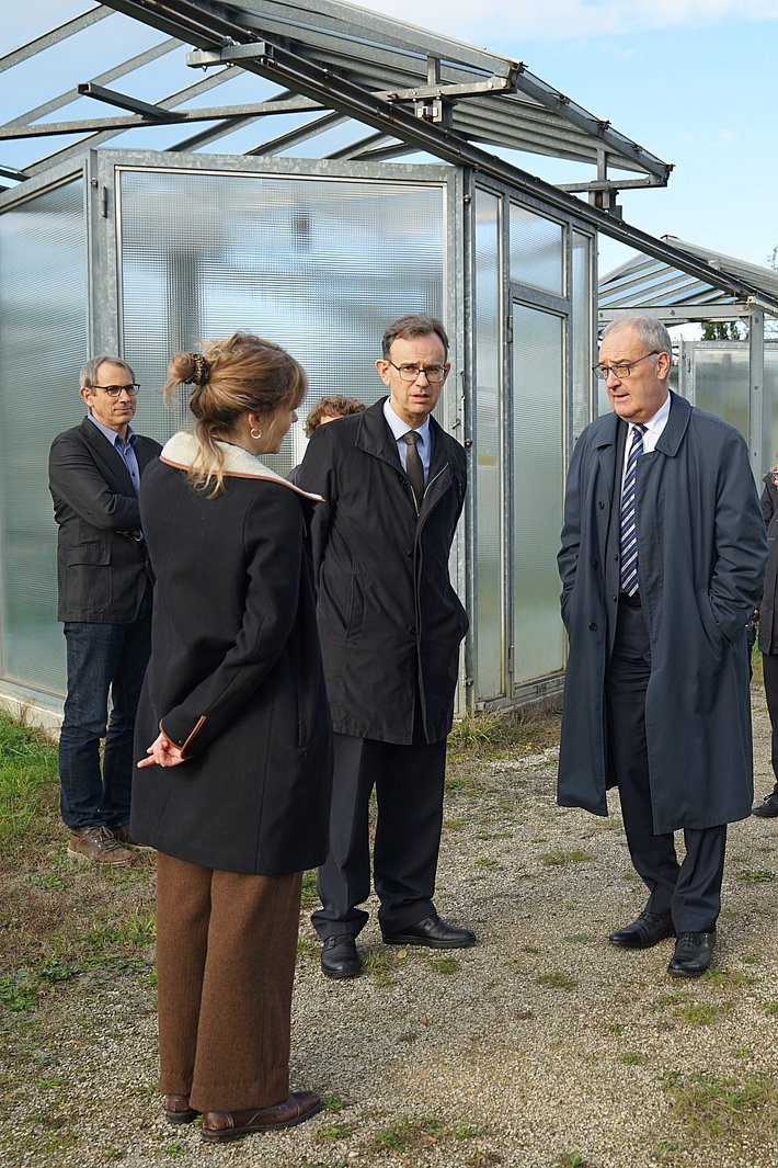 Von Charlotte Grossiord erfuhr Bundesrat Parmelin, wie die Forschenden in der Modellökosystem-Anlage die Auswirkungen von Hitze und Bodentrockenheit auf Waldbäume untersuchen. Diese Anlage besteht aus sechzehn Glaskammern mit Schiebedach, in denen die Temperatur- und Feuchtigkeitszufuhr experimentell verändert werden können.