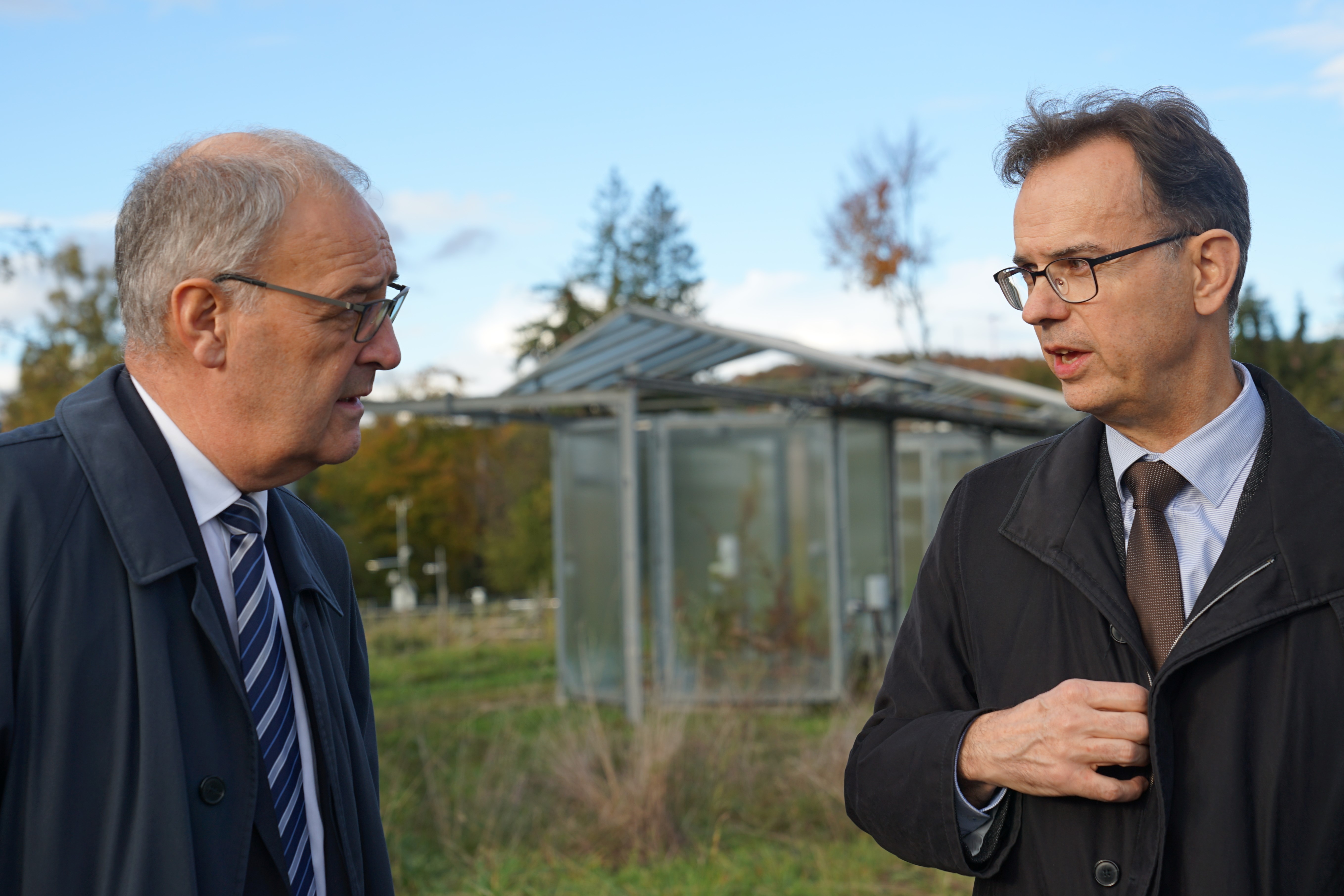 Von Charlotte Grossiord erfuhr Bundesrat Parmelin, wie die Forschenden in der Modellökosystem-Anlage die Auswirkungen von Hitze und Bodentrockenheit auf Waldbäume untersuchen. Diese Anlage besteht aus sechzehn Glaskammern mit Schiebedach, in denen die Temperatur- und Feuchtigkeitszufuhr experimentell verändert werden können.