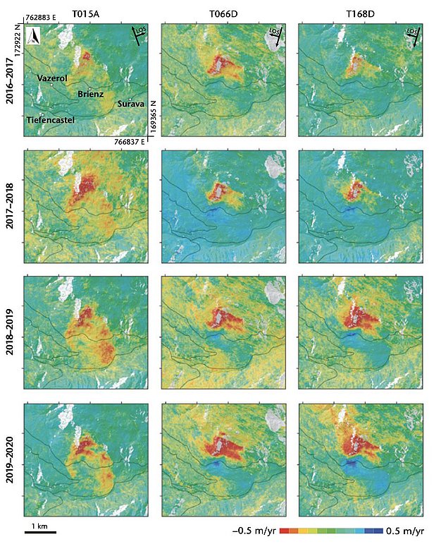 Kein anderer Bergort steht wohl derzeit so oft in den Schlagzeilen wie Brienz/Brinzauls. Das Dorf rutscht bergab ins Albulatal; zwar schon seit Menschengedenken, aber in letzter Zeit immer schneller. Rund 1,5 Meter sind es aktuell pro Jahr im Dorf, gar bis zu 10 Meter im Hang oberhalb der Siedlung. Nicht nur die rund 80 Einwohner und bis zu 200 Feriengäste fürchten um ihre Bleibe, auch die Kantonsstrasse zwischen Davos und Lenzerheide und die Albulalinie der RhB sind in Gefahr. Bund, Kanton und Gemeinde suchen mit Hochdruck nach Lösungen. Unterstützt werden sie durch zahlreiche Fachleute aus Praxis und Forschung – darunter auch mehrerer Gruppen des SLF. Forschende der zum CERC gehörenden SLF-Forschungsgruppe Alpine Fernerkundung messen mittels Radarsatelliten, wo sich der Hang wie schnell bewegt. Zudem lassen sie über Brienz regelmässig mit Kameras bestückte Drohnen steigen. Diese fliegen in Gebiete, die ein Radarsatellit nicht genügend genau erfassen kann, und liefern so zusätzliche Bilddaten.