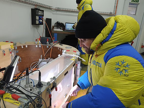 Benjamin Walter erinnert an eine gelb-blaue Mischung aus Teletubby und Michelin-Männchen. Kein Wunder, denn als der Wissenschafter aus der Gruppe Schneephysik die Türe zu seinem Labor öffnet, schlägt ihm eiskalte Luft entgegen. Zwischen minus 20 und minus 25 Grad Celsius, wer hier arbeitet, benötigt einen Schutzanzug, wie ihn Walter trägt. Im Kältelabor des WSL-Instituts für Schnee und Lawinenforschung SLF untersucht er Eigenschaften von Schnee in einem Windkanal. Seine Ergebnisse zeigen beispielsweise, unter welchen Windbedingungen sich Wechten an Berggraten aufbauen und wie sich gefährliche Schwachschichten bilden können.