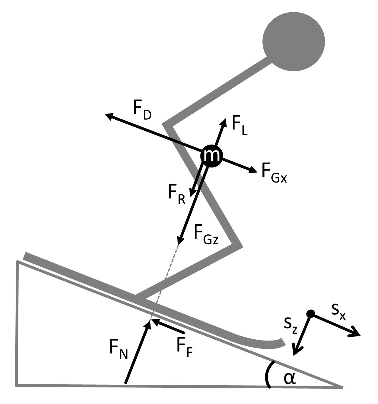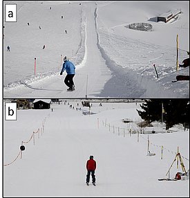 Um einen Slopestyle-Park mit verschiedenen Elementen wie Schanzen, Rails und Boxen etc. zu bauen, braucht es sehr viel Erfahrung und Know-how. Die Geometrie der Sprünge ist komplex. Mit einem gut gestalteten Sprung wird das Verletzungsrisiko reduziert. Entscheidend dabei ist, dass die steile Landezone, die sogenannte Sweetspot-Zone, möglichst lang ist und dem Verlauf der Flugkurve folgt. Dadurch haben Athleten einen gewissen Spielraum und können auch etwas weitere oder kürzere Sprünge ohne allzu grossen Aufprall landen. Falls der Athlet oder die Athletin zu weit oder zu kurz springen, riskieren sie schwere Verletzungen. Damit ein Sprung schön ausgeführt und die Landung in der Landezone erfolgen kann, bedarf es einer genügend langen Anlaufzone bzw. einer optimalen Geschwindigkeit beim Sprung. Diese Geschwindigkeit ist von vielen Parametern abhängig unter anderem von dem Reibungskoeffizienten des Schnees während der Fahrt. Weitere Kräfte, wie die aerodynamischen Kräfte und die Gravitationskraft wirken ebenfalls. «Man weiss, dass die Reibung sehr stark von der Schneebeschaffenheit abhängt. Bis jetzt gibt es keine guten Modelle, welche diese Reibung bei gegebenen Schneeverhältnissen vorhersagen können. Um diese Lücke zu schliessen, haben wir angewandte Versuche durchgeführt,» so der Studienleiter Fabian Wolfsperger, Mitarbeiter der Forschungsgruppe Wintersport und Klima am SLF. In dieser Arbeit werden zum ersten Mal kinematische Daten von Athleten und umfassende Messungen der Schneeoberfläche kombiniert, um den Reibungskoeffizienten von Freestyle-Skiern und Snowboards bei einer Vielzahl von Schneebedingungen zu bestimmen.