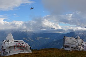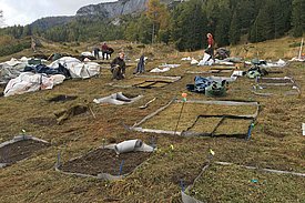 Weil noch wenig bekannt ist dazu, ob und wie es zum Verdrängungskampf in den Alpen kommen wird, haben Forschende der WSL und der ETH Zürich am Calanda bei Chur ein Experiment begonnen. Sie versetzten insgesamt 80 je einen Quadratmeter grosse und 125 Kilo schwere Grasplatten samt Wurzeln von 2100 auf 1400 Meter Höhe; zwanzig Mal musste der Helikopter dazu hin und her fliegen. Diese Woche verpflanzten die Wissenschaftler zudem die Konkurrenten aus dem Tiefland in die umgelagerten Grasplatten. „Wir machen dies im Herbst, weil die Pflanzen in der Winterruhe weniger empfindlich auf Störungen reagieren“, sagt Loïc Pellissier, Professor für Landschaftsökologie an der ETH Zürich und an der WSL, der die Studie zusammen mit Jonathan Levines Gruppe von der ETH Zürich durchführt.