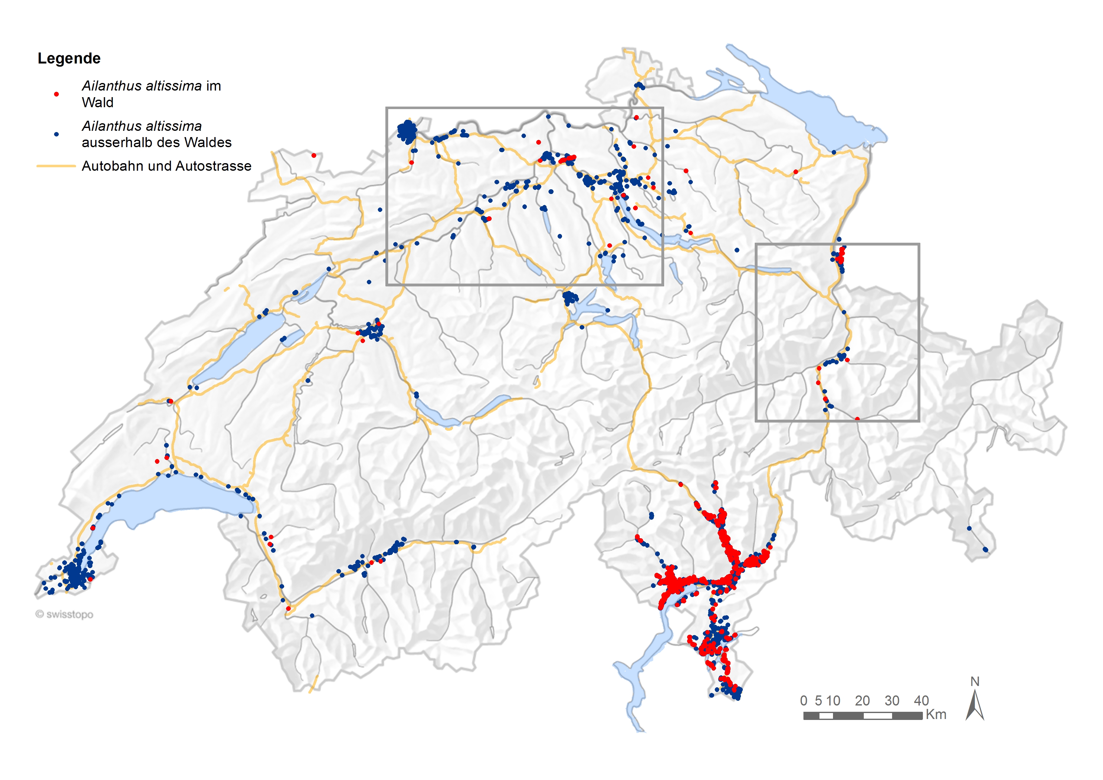Im Rahmen eines von der WSL und dem Bundesamt für Umwelt BAFU finanzierten Projektes wurden erstmals umfangreiche Daten zur Verbreitung des Götterbaumes in der Schweiz aus verschiedenen Datenbanken zusammengetragen, durch aktuelle Beobachtungen ergänzt und in einer nationalen Karte dargestellt.