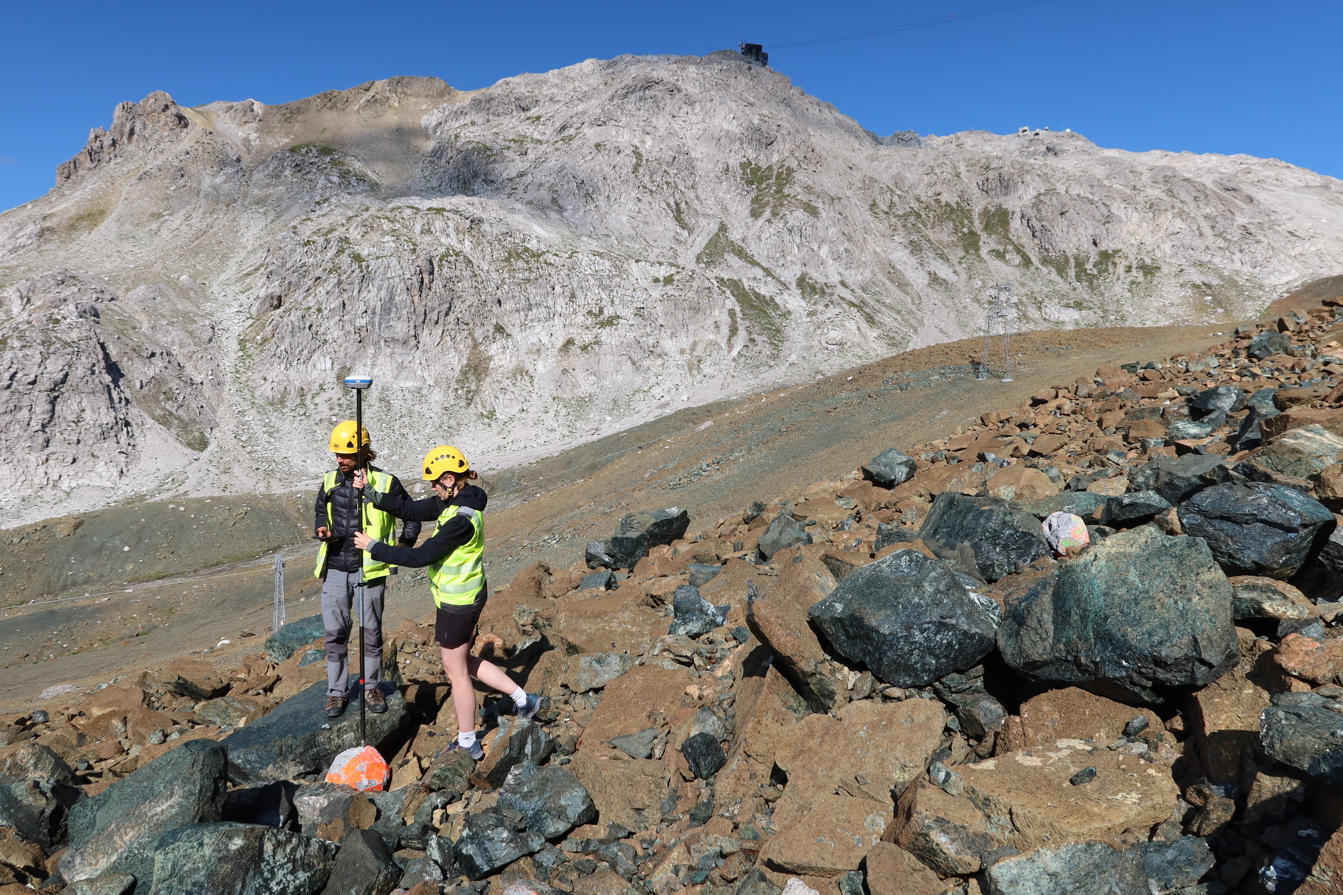 Ab und zu entsteht bei den Tests eine Pause. Dann ist der Wanderweg frei und SLF-Fernerkundungsspezialist Andi Stoffel vermisst das Gelände, in dem die Steine liegen, mit Hilfe einer Drohne. Von oben sieht es aus, als hätte jemand einer Partie Boccia am Hang gespielt, mit zugegebenermassen grossen Kugeln.