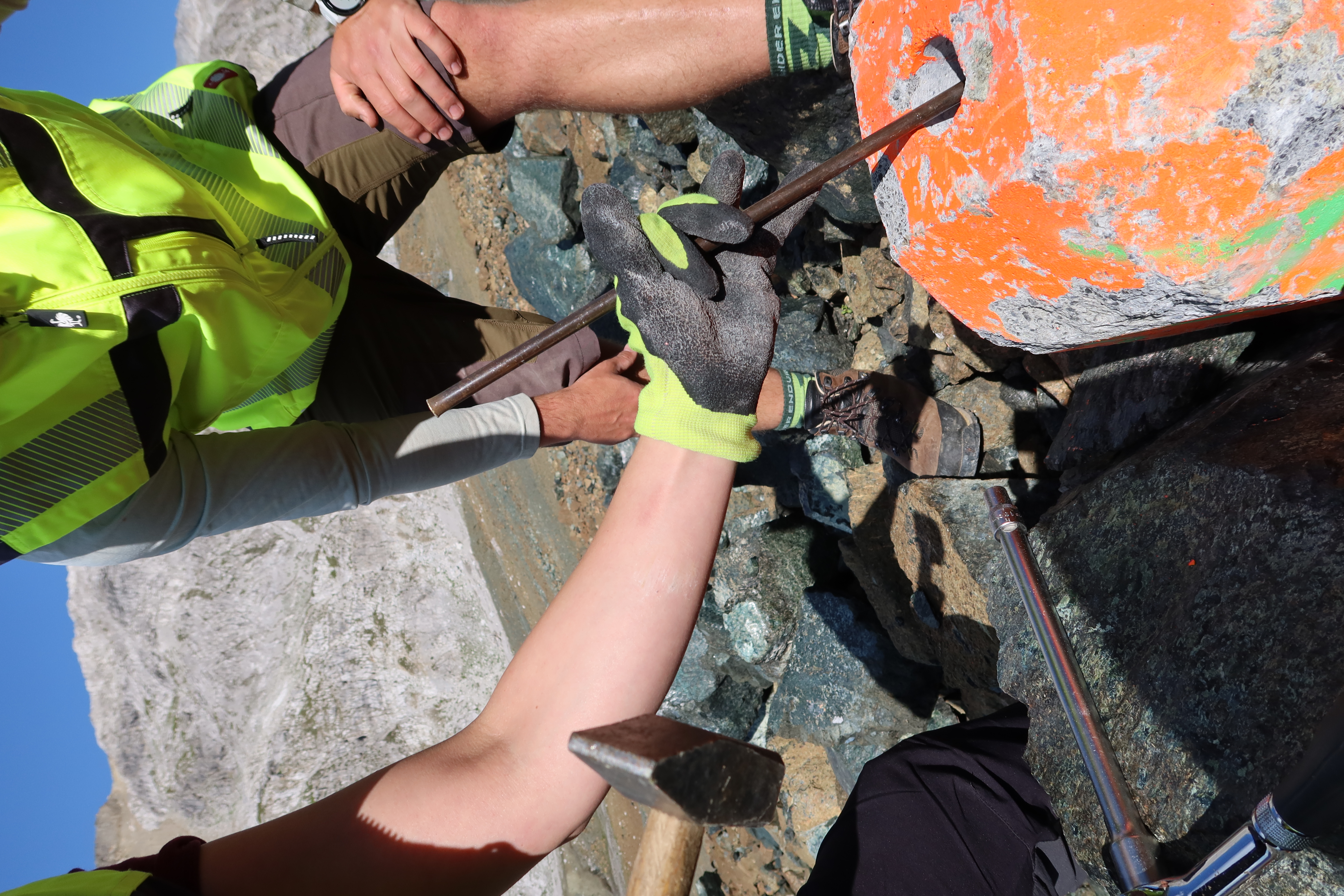 Borner und seine Helferinnen und Helfer stecken lange Metallzylinder in vorgebohrte Löcher und verkeilen sie. «Man darf sie nicht zu fest anziehen, sonst brechen Teile raus», warnt der Forscher. In jedem dieser Zylinder steckt ein Sensor. Eine Forscherkollegin protokolliert genau, welcher Sensor in welchen Zylinder und in welchen Stein kommt. Mit deren Hilfe misst Borner diverse Daten, unter anderem die Beschleunigung und Rotationsgeschwindigkeit.