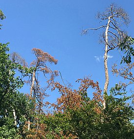 - Die Buche: Vor allem in der Nord- und Nordwestschweiz, aber auch in den angrenzenden Ländern, wurden im Sommer 2018 die Blätter zahlreicher Buchen frühzeitig braun. Im günstigsten Fall vertrockneten die Blätter nur vorzeitig, damit sie nicht mehr so viel Wasser verdunsteten wie in den Wochen zuvor, im ungünstigsten Fall starben Buchen ab.