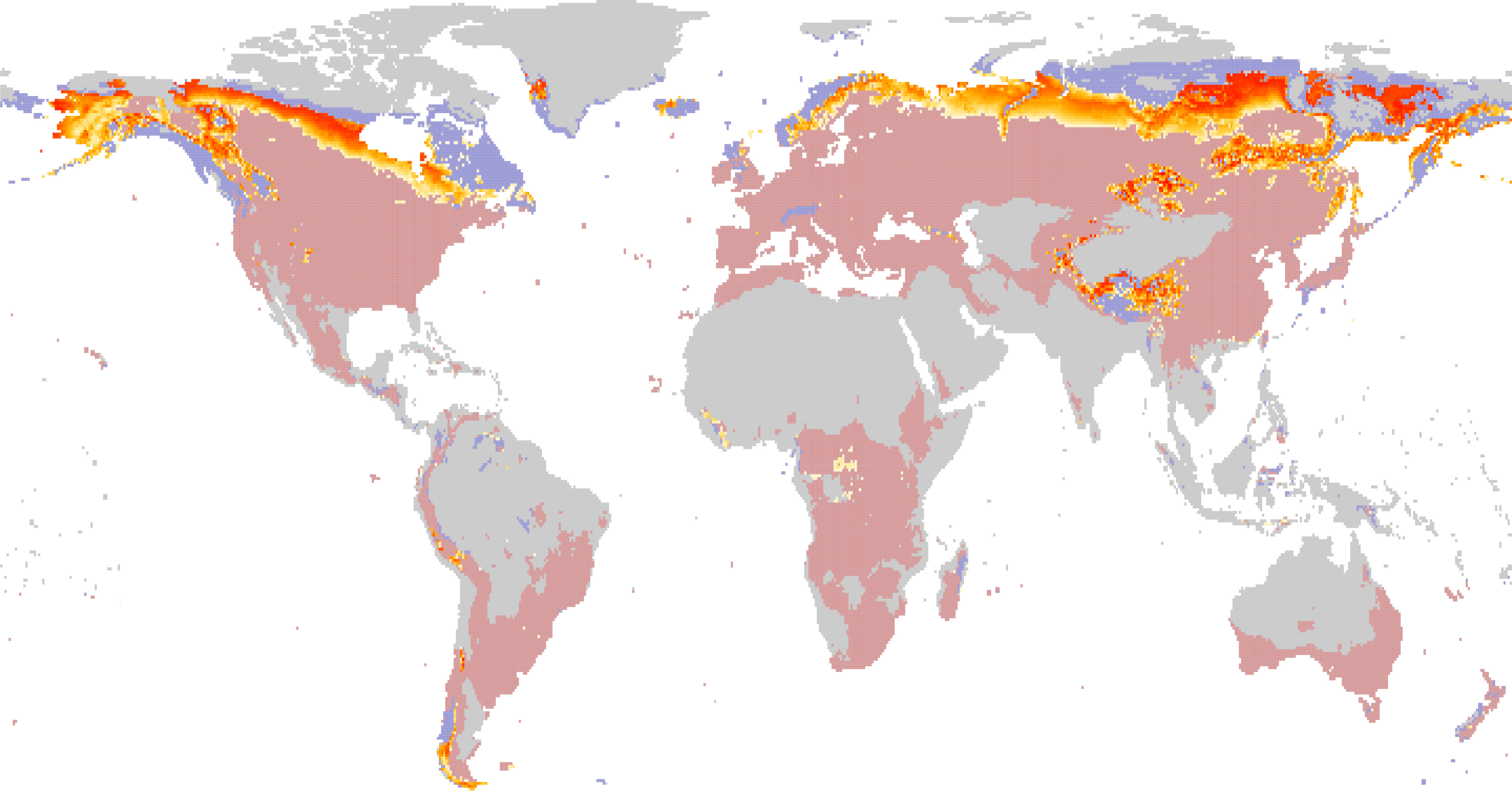 Der Vergleich des Jahrringwachstums in den beiden Perioden zeigt, dass Bäume fast überall in der Welt in der späteren Periode mehr unter Trockenheit litten als in der früheren. Das Gebiet, in dem das Baumwachstum von Kälte begrenzt wird, ist von der frühen zur späten Zeitperiode weltweit deutlich kleiner geworden. Abbildung 1 zeigt, dass dies vor allem die boreale Zone Eurasiens und Nordamerikas sowie die Hochlagen der grossen Gebirgsmassive in den Alpen, Patagoniens und Tibets betrifft. Dort war die Erwärmung überdurchschnittlich stark, die Niederschlagsmenge hingegen veränderte sich nur unwesentlich. Also verdunsteten die Bäume mehr Wasser, der Boden und die Luft wurden trockener und es ereigneten sich vermehrt Trockenperioden. Es ist davon auszugehen, dass sich in diesen Regionen sowie in der borealen Zone der Trend zur Erwärmung weiter fortsetzen wird.