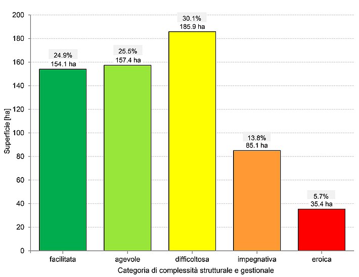Das Endergebnis ist die Zuordnung jeder Weinbaufläche zu einer von fünf Kategorien struktureller Komplexität. Diese reichen vom erleichtertem bis hin zu heroischem Weinbau. Im konkreten Fall der Fallstudie weist die Hälfte der Weinbaufläche einen hohen Grad an Komplexität auf, der von schwierigem (30%), anspruchsvollem (13,8%) bis hin zu heroischem (5,7%) Weinbau reicht, während die restlichen Prozentsätze zu gleichen Teilen auf die erleichterte und leichte Kategorie verteilt sind.