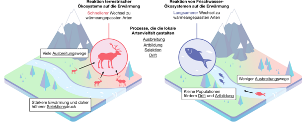 Ein wichtiger Prozess, der die Biodiversität an einem Ort gestaltet, ist die Ausbreitung: Neue Arten wandern ein, andere Arten wandern aus ihrem angestammten Gebiet aus. Es ist ein stetes Kommen und Gehen. In ihrer Studie kommen die Forschenden zum Schluss, dass sich Landorganismen leichter ausbreiten als Süsswasserorganismen. Landökosysteme sind in der Regel gut vernetzt, sodass Landbewohner relativ frei zu neuen Standorten wandern können. Für Süsswasserbewohner ist es hingegen schwieriger, in neue Lebensräume vorzudringen, da ihre Lebensräume weniger gut miteinander verbunden sind.