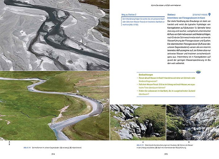 Auf den Exkursionen lassen sich in einer Karstlandschaft verschiedene Quelltypen und ihre Bewohner ausfindig machen. Entlang der Wege können das Verlanden von Seen und das vielgestaltige Mosaik von blaugrünen Lebensräumen wie Flach- und Hochmoore, Feuchtwiesen und Bruchwälder erkundet werden. Mit etwas Glück lassen sich nicht nur Biberspuren sondern auch der eifrige Dammbauer selber erspähen. Tintenstriche in den Gletscherlandschaften der Alpen bekommen mit den Erklärungen im Buch eine neue Bedeutung. Zahlreiche Fotos machen zudem das unterirdische Leben im Grundwasser sichtbar wie die Flohkrebse oder pflanzliches und tierisches Plankton, das von Auge kaum erkennbar ist. Selbst in Städten und Agglomerationen finden sich für die Erholung der Menschen wichtige blau-grüne Lebensräume.