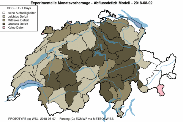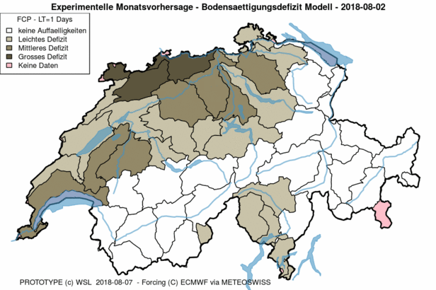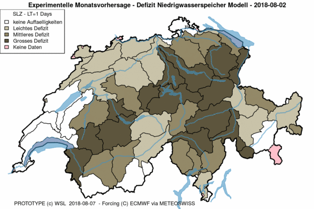Seit Wochen verdunstet in der Schweiz immer mehr Wasser aus Böden, Gewässern und Grundwasser. Auf der Trockenheits-Plattform trockenheit.ch veröffentlicht die Forschungsgruppe Hydrologische Vorhersagen der Eidg. Forschungsanstalt für Wald, Schnee und Landschaft WSL bereits seit 2012 Berechnungen* zu den Wasserdefiziten in der Schweiz, allerdings bisher nur auf fünf Tage hinaus. Das ist die Zeitspanne, in der Wettermodelle Niederschläge, die möglicherweise Hochwasser verursachen können, mit ausreichender Sicherheit vorhersagen.