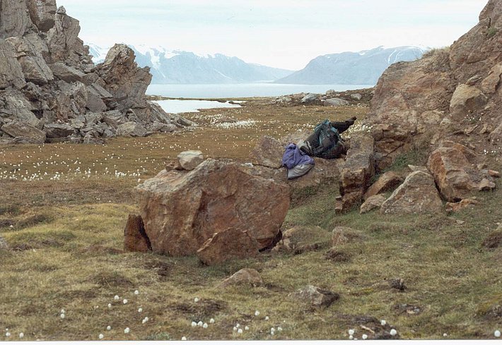 Das Wetter ist gut und die Arbeit läuft. Nur wie schützt man sich in der Nacht vor möglichen Besuchen von Eisbären? Zum einen bauen wir einen Eisbärenzaun um das Zelt herum auf. Der hält keinen Eisbären ab, aber es gibt einen Warnknall, wenn ein grosses Tier (oder ein Mensch) in die Schnur des Zaunes läuft. Dann muss man allerdings auch in zwei Sekunden aus dem Schlafsack und Zelt sein, um zu reagieren. Uns ist das an Sicherheit nicht genug, und wir beschliessen, Nachtwache zu halten. Das bedeutet Drei-Stunden-Schichten für jeden, also beispielsweise von Mitternacht bis drei Uhr morgens, von drei Uhr bis sechs Uhr oder von sechs Uhr bis neun Uhr. So bekommt jeder knapp sechs Stunden Schlaf. Wenig, aber das muss reichen. Die Sonne scheint sowieso 24 Stunden am Tag, und der Ausblick vom Camp entschädigt für den Schlafmangel. Die mittlere Schicht ist nicht die beliebteste, wurde aber manchmal durch wenig scheue Schneehasen belohnt, die selbst im Sommer fast ganz weiss sind. Auch Moschusochsen näherten sich dem Camp, drehten aber rechtzeitig ab. Anzahl Eisbären: zum Glück null.