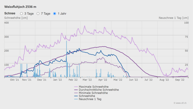 Am 6. Juni 2022 ist das Versuchsfeld des SLF auf dem Weissfluhjoch ausgeapert. Dies ist die zweitfrüheste Ausaperung seit den manuellen Messungen im Winter 1936/37. Auffallend in der Statistik ist eine Häufung der frühesten Ausaperungsdaten in den letzten dreissig Jahren. Und einen Rekord gab es im Winter 2021/22 auch noch.