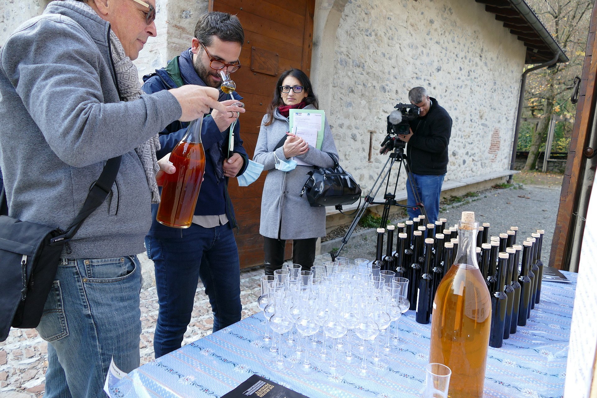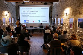 Produzenten und Medienvertreter an der Tagung in der "Corte del Vino", Morbio Inferiore. Foto: Gottardo Pestalozzi, WSL