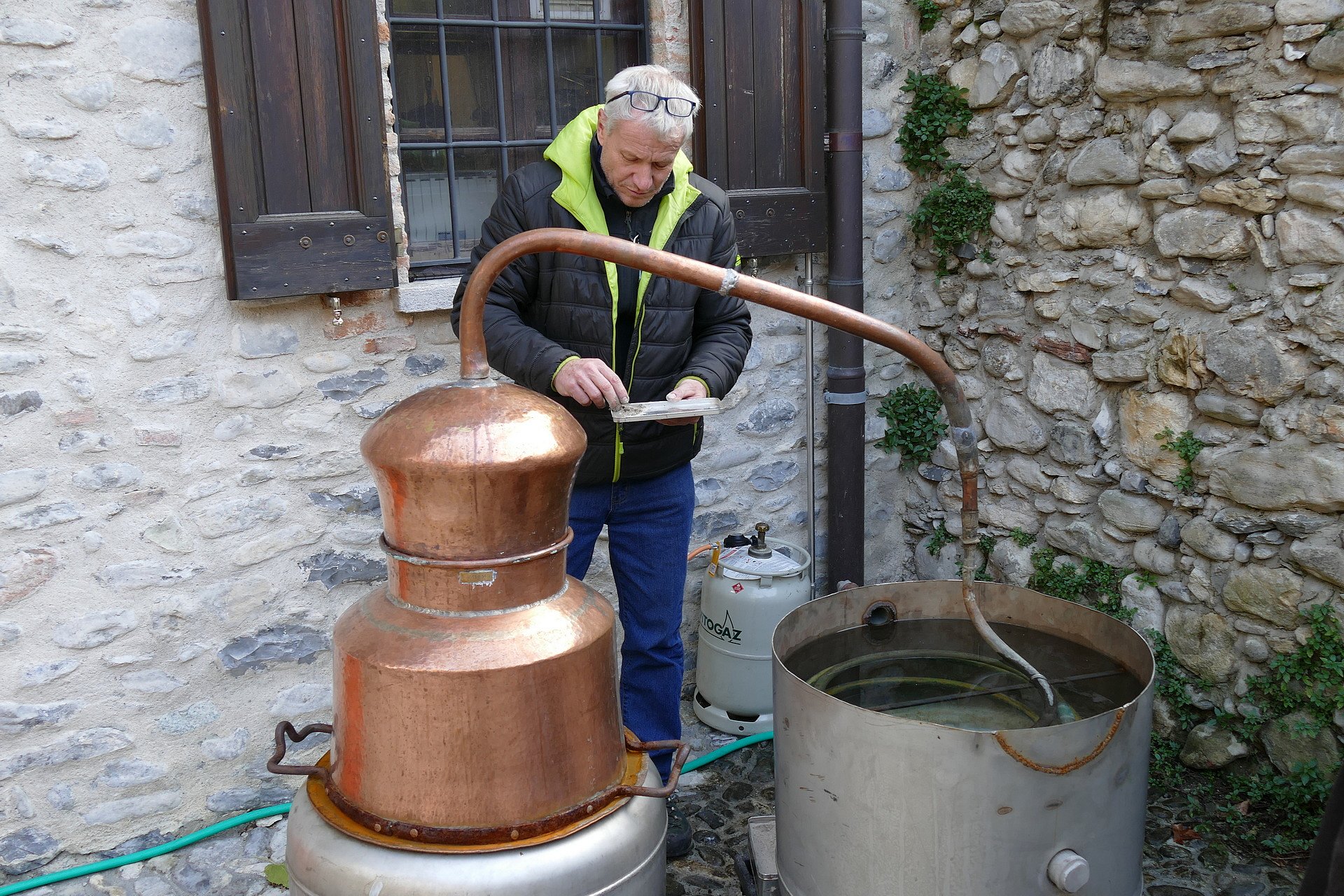 Störbrenner Pier Jelmini zeigte den Brennvorgang an seiner transportablen Brennerei. Foto: Magdalena Klotz