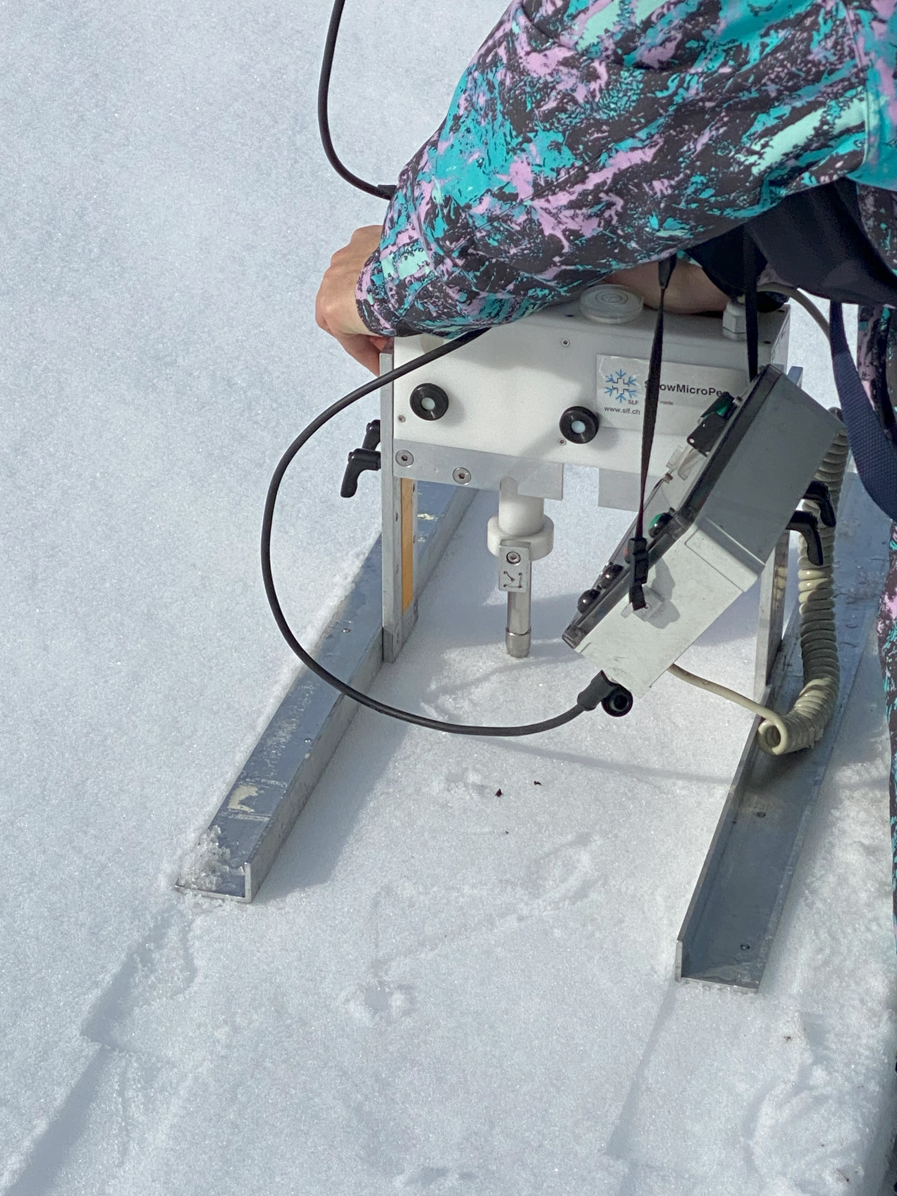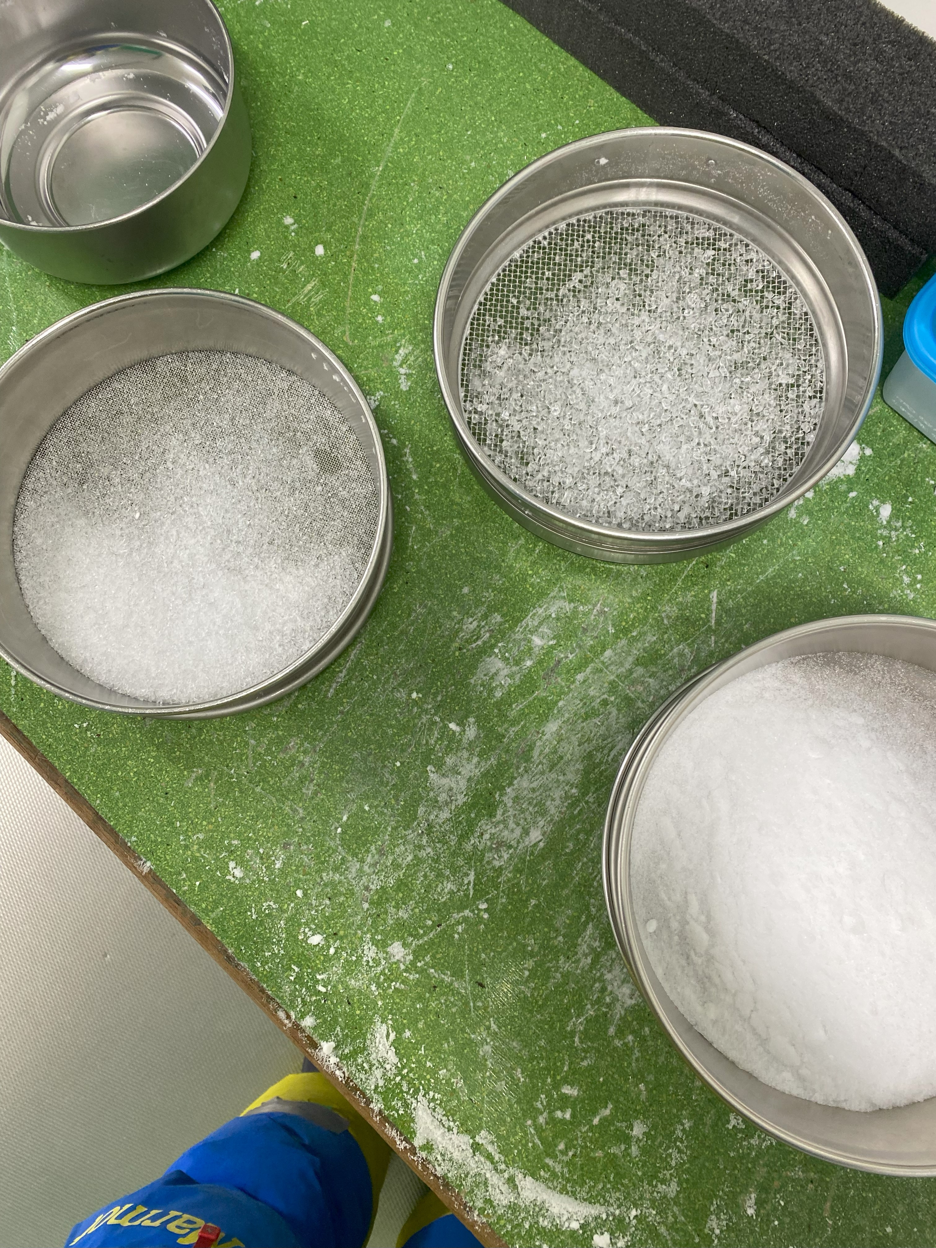Am folgenden Tag stand schon das erste Mal Feldarbeit an. Ich fuhr also mit Julia und Anja nach Laret, um ein Schneeprofil zu erstellen. Wir sahen nichts, was ausserhalb des Messfeldes ist, weil es so neblig war. Hin und wieder hörten wir einen Geisterzug vorbeifahren, denn sehen konnten wir ihn nicht. Bei dem Schneeprofil habe ich auch das SMP (SnowMicroPen) kennengelernt. Das SMP ist ein hochsensibler Kraftsensor, der mit konstanter Geschwindigkeit in den Schnee fährt und dabei 250x pro Millimeter den Eindringwiederstand misst. Somit werden die Eigenschaften der Mikrostruktur des Schnees gemessen. Zurück im SLF konnte ich die Daten digitalisieren. Ich habe mich zuvor mit der Website NiViz auseinandergesetzt und dann begonnen, die Daten einzutragen. Zum Abschluss der ersten Woche konnte ich am Freitag das erste Mal mit Fabian ins Kältelabor. Wir haben den Schnee für die «Snow Gluer»-Proben vorbereitet. Dafür benötigten wir groben «Schnee» und ganz feinen «Schnee». Dies bekamen wir, indem wir Eis mit einer Käsereibe zerkleinerten und dann siebten.
