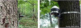 Dendrometer sind Messgeräte, die an Baumstämmen angebracht werden, um Durchmesserschwankungen mit hoher räumlicher (Mikrometer) und zeitlicher (Stunden) Auflösung zu überwachen. Die Daten werden auf einem Datenlogger gespeichert oder direkt in die Cloud auf einen zentralen Server gesendet. Dendrometer gibt es in verschiedenen Formen und Größen. Punktdendrometer (Foto links) erfassen nur einen winzigen Punkt auf dem Stamm und sind sehr präzise. Banddendrometer (Foto rechts) messen den ganzen Umfang von Stämmen, sind aber weniger genau und auch anfälliger für Artefakte wie z.B. Temperaturschwankungen. Obwohl Dendrometermessungen von Forschenden über Jahre hinweg und an Hunderten von Forschungsstandorten gesammelt wurden, sind sie nur selten zu grösseren Netzwerken zusammengefasst worden, wie das in dieser Studie passierte. Das Schweizer Dendrometernetzwerk heist TreeNet und wird von der WSL, der Uni Basel, dem IAP Witterswil, der ETH Zürich und mit finanzieller Unterstützung des BAFU betrieben.