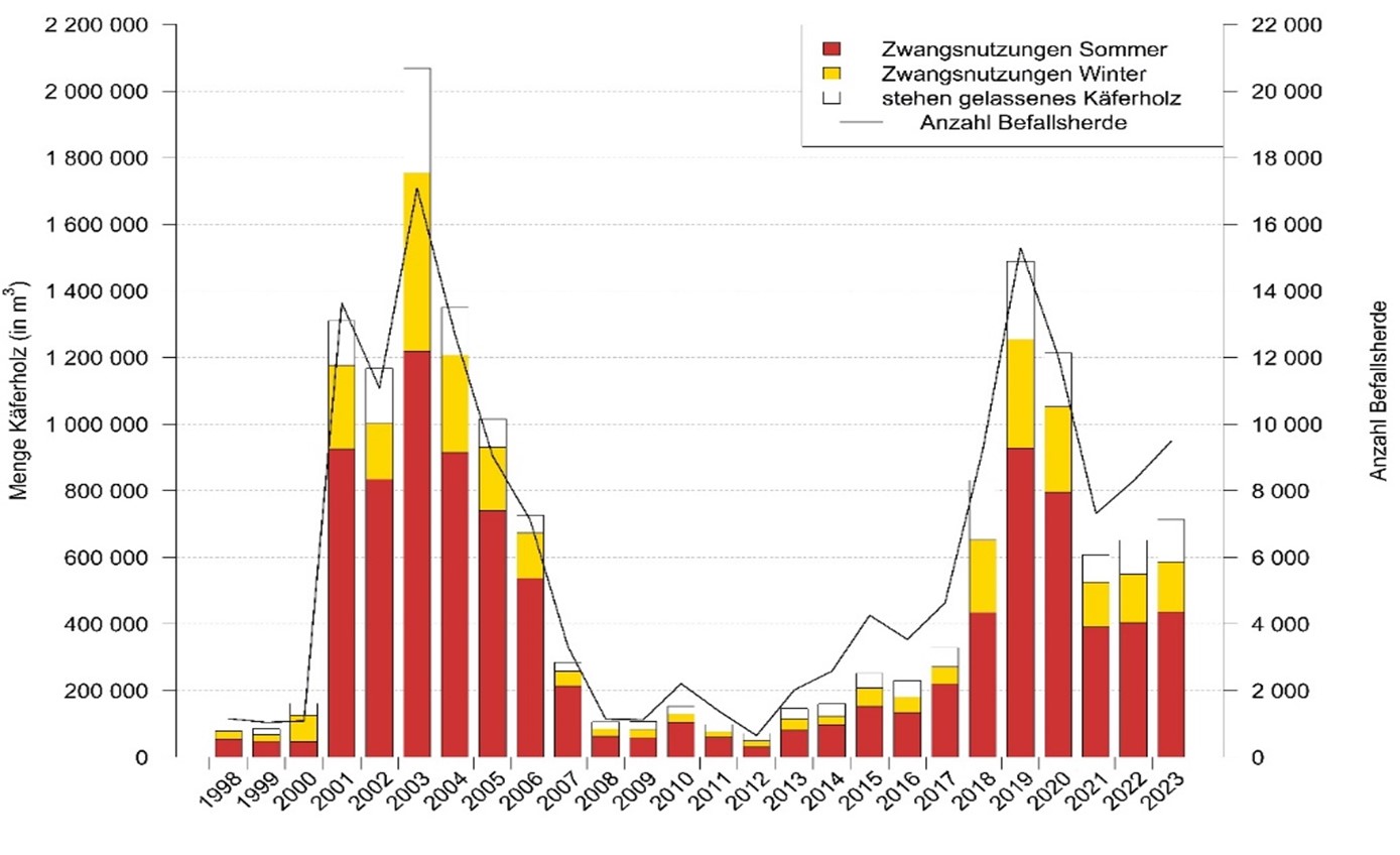 Mit einem Gesamtvolumen von 436'563 Kubikmetern verzeichnete die Schweiz 2023 im Vergleich zum Vorjahr einen Anstieg der durch den Buchdrucker verursachten Sommerzwangsnutzungen von rund 8%. Noch auffälliger war die Zunahme der Befallsherde, die mit 9'493 Herden eine Steigerung von 14% im Vergleich zum Vorjahr erlebten. Ebenfalls erhöhte sich das geschätzte Gesamtvolumen des vom Buchdrucker befallenen Fichtenholzes um etwa 10% auf 713'210 Kubikmeter. Diese Zahl errechnet sich aus den effektiven Sommerzwangsnutzungen sowie den geschätzten Werten für Winterzwangsnutzungen und stehengelassenes Käferholz, basierend auf Erfahrungswerten der letzten 20 Jahre. Die Schätzungen sind nötig, da die beiden Werte jeweils erst im Folgejahr erhoben werden. Im Jahr 2023 wurden schweizweit insgesamt 1'278 für den Buchdrucker spezifische Lockstofffallen betrieben, die mittlere Fangzahl pro Falle lag dabei bei 24'577 Käfern, was einem Anstieg von rund 77% im Vergleich zum Vorjahr entspricht.