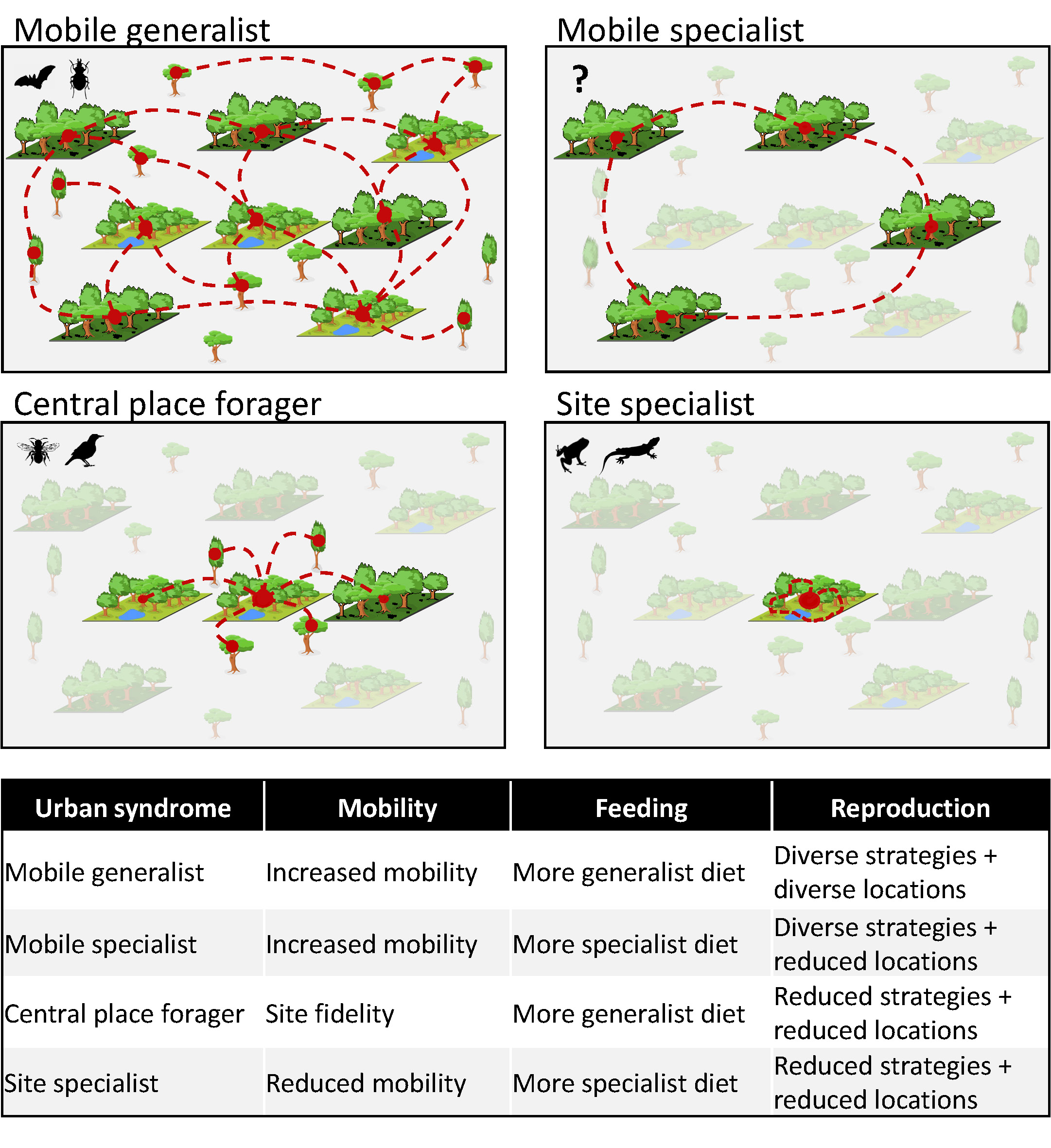 Die Analyse zeigt jedoch, dass durchaus auch Spezialisten eine Überlebenschance haben, wenn sie entsprechende Lebensbedingungen finden. Tatsächlich fanden die Forschenden unterschiedliche Lebensstrategien oder ‘urban trait syndromes’, die sie in vier Gruppen einteilten (siehe Box). Sie unterscheiden sich vor allem darin, wie die Tiere Nahrung finden und sich fortpflanzen.