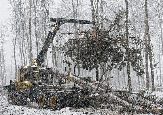 Heute ernten Urs Schaub und sein Team vom Forstrevier Violental Buchen, Föhren und Eschen in einem Waldstück bei Arisdorf. Den Greifarm des Tragschleppers haben die Forscherinnen mit einer Waage ausgerüstet. Zu jedem angeschleppten Baum oder Baumteil lässt sich Marina das Gewicht durchgeben. Danach sägen ihre Arbeitskollegen Stammscheiben ab und wägen sie vor dem Transport in die WSL-Schreinerei. Dort schneiden weitere Projektmitarbeitende Holzkeile aus, deren Masse sie erst frisch und dann trocken messen. Am Schluss werden die Holzstücke zu feinem Pulver gemahlen, damit eine Labormitarbeiterin den Kohlenstoff- und Stickstoffgehalt ermitteln kann. Der gesamte Ablauf ist in einem Kurzfilm dargestellt.