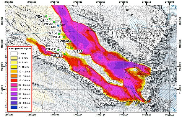 Bei einer Feldbegehung analysieren Margreth und sein Team, wo Lawinen anbrechen können. Hilfreich sind bei der Beurteilung (wenn vorhanden) historische Winterfotos oder Aufzeichnungen zu früheren Lawinenabgängen. In einem nächsten Schritt berechnen die SLF-Fachleute mit dem Lawinensimulationsprogramm RAMMS die Fliesshöhe und die Geschwindigkeit von Fliess- und Staublawinen für verschiedene Szenarien. Anschliessend interpretieren sie die Daten. «Wir wollen wissen, wie die Lawinendrücke flächig verteilt sind. Anhand von Intensitätskarten, erarbeiten wir anschliessend die Gefahrenkarten», sagt Margreth. Die Gefahrenkarten mit gelben, blauen und roten und weissen Gebieten dient als Basis für die Ausscheidung von Gefahrenzonen in der Nutzungsplanung und der Formulierung von Bauauflagen im Rahmen der Baubewilligungsverfahren.
