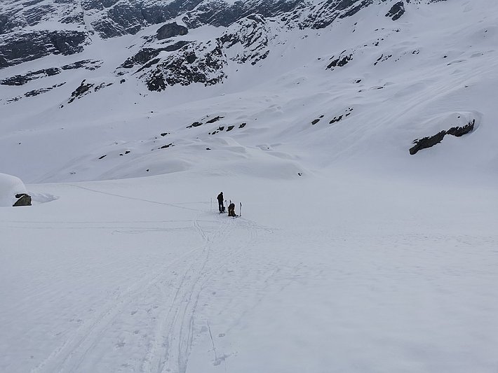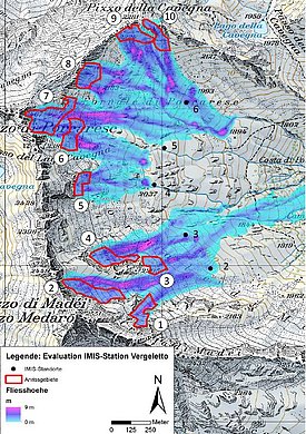 Deshalb soll nun eine neue IMIS-Messstation aufgebaut werden. Dafür sind jedoch zunächst einige Vorarbeiten nötig, denn nicht jeder Standort ist geeignet. Im Hochgebirge ist die Suche danach nicht so einfach und kostenintensiv. Weil die Schneeablagerung aufgrund der Wechselwirkung zwischen Gelände und Wind grundsätzlich unregelmässig ist, müssen Schneestationen – wenn möglich – an windgeschützten, flachen Standorten stehen. Sie dürfen zudem nicht lawinengefährdet sein, um repräsentative Informationen zur Schneedecke liefern zu können. Zu Beginn haben Vertreter des Kantons Tessin sechs mögliche Standorte im Valle di Vergeletto auf der Karte ausgesucht, deren Lage das SLF auf die grundsätzliche Eignung beurteilt hat. Zur Analyse der Lawinengefährdung haben Experten des SLF die Simulationssoftware RAMMS eingesetzt und so die Sturzbahnen, Kräfte und Fliesshöhen von potenziellen Lawinen berechnet. Nach diesen eher theoretischen Arbeiten besuchten die Verantwortlichen des Kantons Tessin und des SLF das Valle di Vergeletto sowohl im Sommer als auch im Winter. So konnten sie die topographischen Verhältnisse sowie die Schneedecke direkt vor Ort begutachten und in die Evaluation einfliessen lassen.
