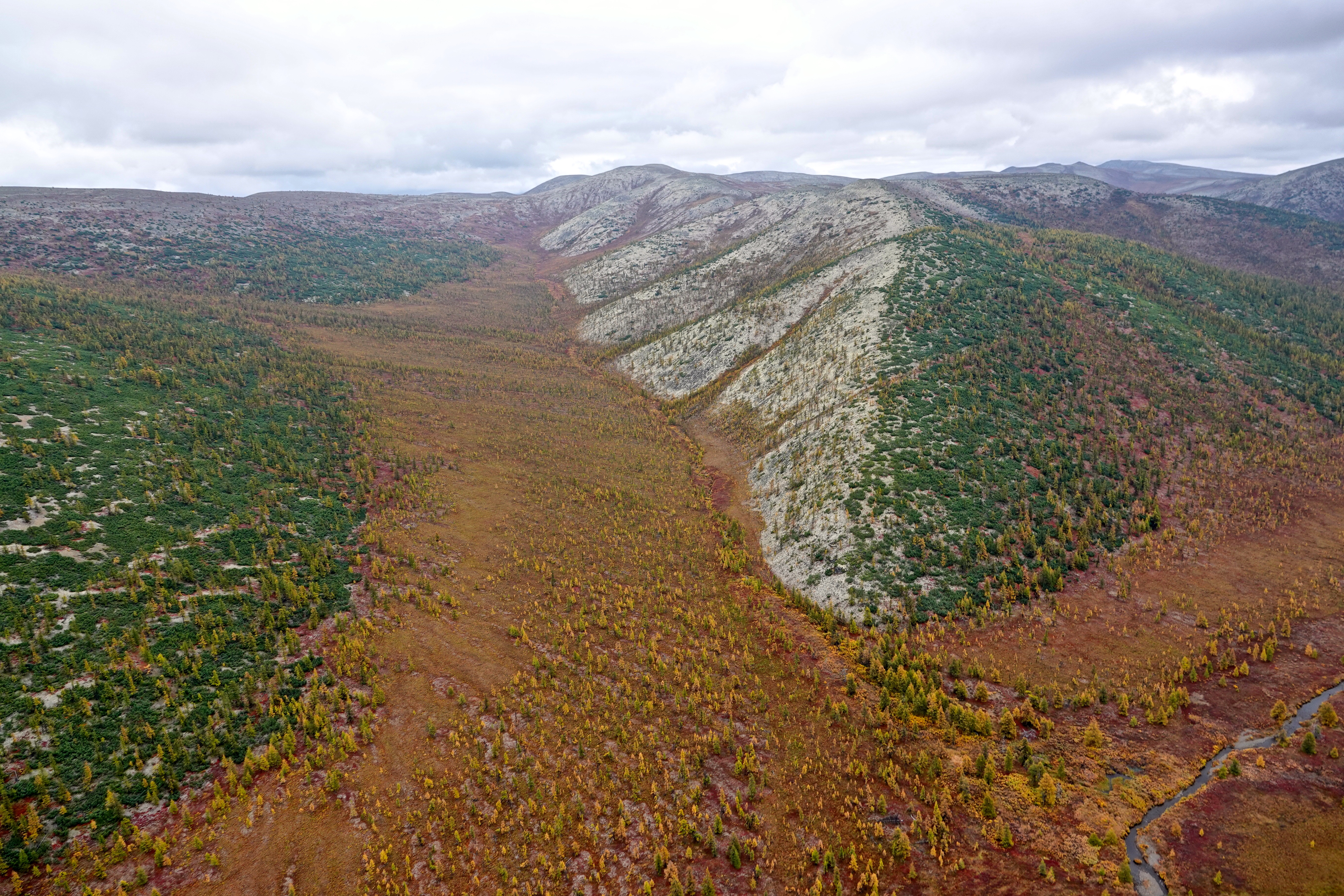 In late August and early September 2019, we undertook the first interdisciplinary and international pilot mission to Anyui volcano, where we sampled living and dead larch trees (Fig. 3; Larix cajanderi Mayr) using increment corers and chain saws. During our pilot expedition, we used helicopter support (based out of the settlement of Kiperveem about 60 km distant) to reach the volcano and to relocate between temporary field camps on the lava flow field along a roughly 1000 m elevation gradient (Fig. 4).