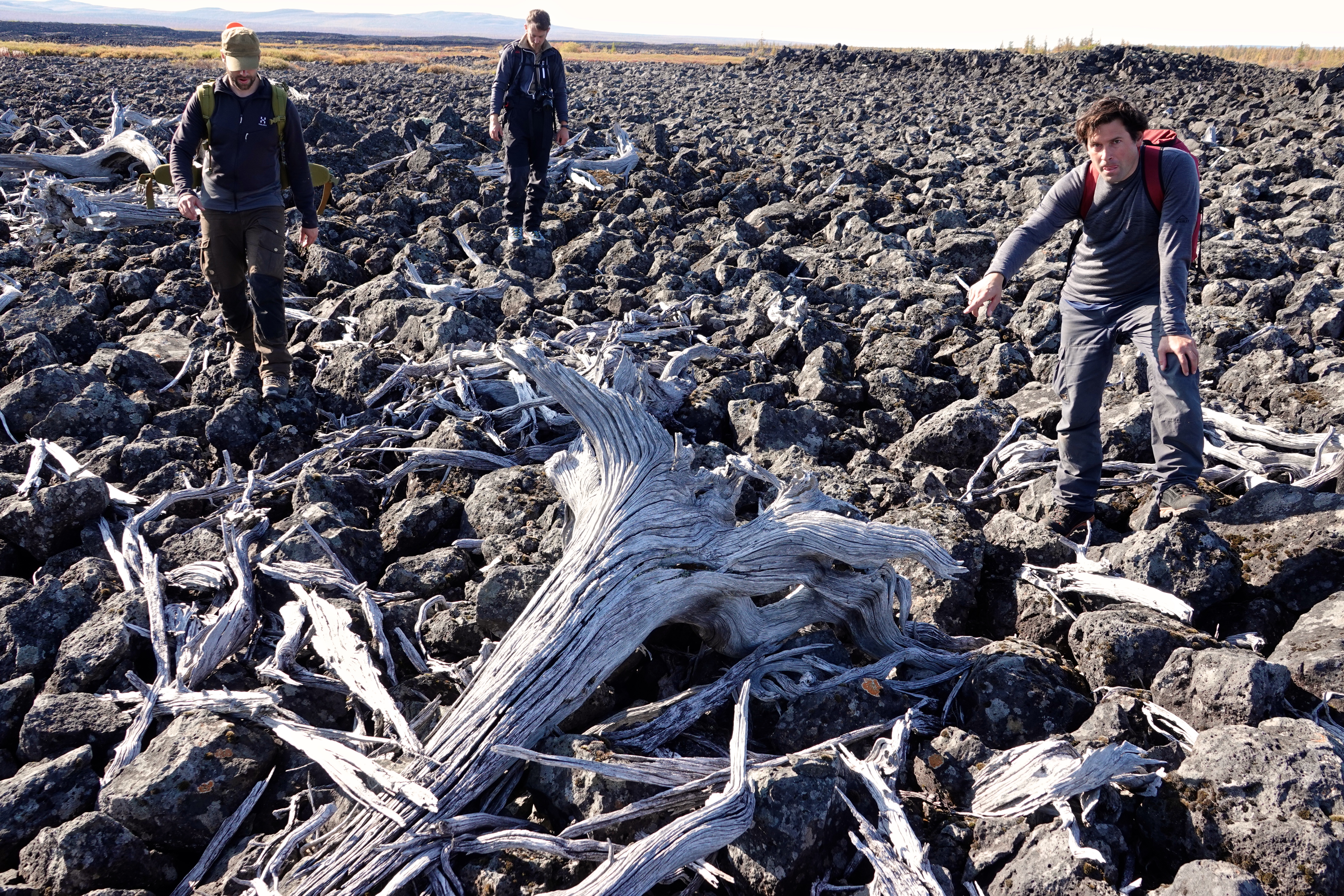 Our first field camp was located close to the volcano vent (67°11’46.14’’N, 165°53’04.69’’E and 570 m asl). We used further helicopter support to transfer to successive field camps along the 56 km-long lava flow field. We ranged up to several kilometres from each camp on foot to conduct the dendrochronological and geological sampling. We collected many core and disc samples from recent and relict conifers, and plenty of rock and sediment samples.