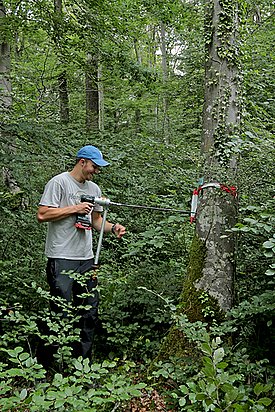 Im Sommer 2020 wurden von jedem Baum zwei Bohrkerne entnommen (Abbildung 8), um anhand der Jahrringe die langjährigen Wachstumsmuster zu untersuchen. Es wird erwartet, dass darin Hinweise auf mögliche Schwächungen gefunden werden, die an schmalen Jahrringen zu erkennen sind. Zudem wurde im Sommer 2020 und 2021 die Kronenmortalität der Buchen anhand des Prozentsatzes toter Äste und der Kronenverlichtung abgeschätzt. Im Herbst 2020 wurden in den neun Beständen Bodenprofile erhoben, die Bodenmächtigkeiten gemessen und weitere Parameter bestimmt. Aufgrund dieser Daten wird für jeden Bestand die Speicherkapazität des verfügbaren Bodenwassers bestimmt. Im Sommer 2021 wurde die Kronenmortalität der Buchen ein weiteres Mal abgeschätzt und es wurden zusätzliche Standortparameter erhoben, wie die Konkurrenzstärke zwischen den Bäumen.