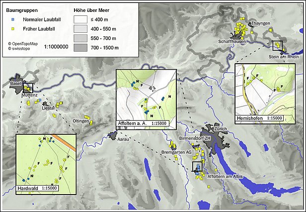 Im August 2018 wurden in den Regionen Baselland, Schaffhausen, Bremgarten und im westlichen Kanton Zürich 964 Buchen markiert und hinsichtlich sichtbarer Schäden bewertet (Abbildung 2).