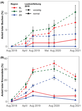 Die Erhebungen zeigten, dass von den im Jahr 2018 ausgewählten Buchen im Verlaufe von vier Jahren 4.4 % abgestorben sind (Abbildung 5). Von den Buchen mit vorzeitigem Laubfall starben in der Region Schaffhausen rund 10 Prozent, in der Region Baselland rund 7 % und in der Region Knonaueramt/Bremgarten rund 4 % ab. Buchen, die ihr Laub 2018 zum normalen Zeitpunkt verloren zeigten deutlich geringere Mortalität; in Baselland waren es 2 %, während in der Region Knonaueramt/Bremgarten 2021 alle überlebten. Zusätzlich zu den toten Bäumen wurden 21 % der beobachteten Buchen im Laufe der Studie gefällt ― meist aus Sicherheitsgründen. Im zweiten Jahr nach der Sommerdürre (2020) erreichte der Anteil toter Äste in der Krone einen Höchststand von 25 % des Kronenvolumens (Abbildung 5). Danach sank der Totastanteil wieder leicht, weil neue Äste nachwuchsen. Diese Beobachtung könnte ein Anzeichen für eine – zumindest vorübergehende – Erholung sein.