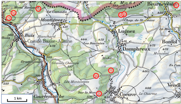 Zusammen mit dem Office de l’Environnement des Kantons Jura wurden Anfang 2020 neun mehr als 100 Jahre alte Buchenbestände mit unterschiedlichen Anteilen stark geschädigter Bäume ausgewählt, je drei Bestände mit einem Anteil von > 75%, 50% und 10% (Abbildung 7). Zusammen mit dem Institut für Angewandte Pflanzenbiologie (IAP) und Waldschutz Schweiz (WSL) wurden im Frühling 2020 in jedem Bestand 21 Buchen ausgewählt und markiert (total 189 Bäume).