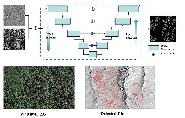 In Switzerland, with its steep topography and frequent precipitation, forests face major challenges in terms of soil erosion, flooding and drainage. Ditches within forests are therefore essential for controlling excess surface water, lowering the groundwater level in wet areas of forests and helping to prevent landslides, flooding and the degradation of forest roads and infrastructure. With increasing awareness of environmental sustainability, ditch systems are being used to balance water flow without overly disrupting ecosystems. Proper ditch detection and maintenance within forests is critical to protect the environment and infrastructure, especially in the context of climate change, which brings more intense rainfall vents and poses risks to forest ecosystems.