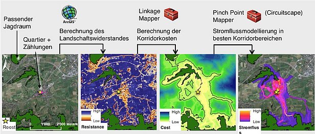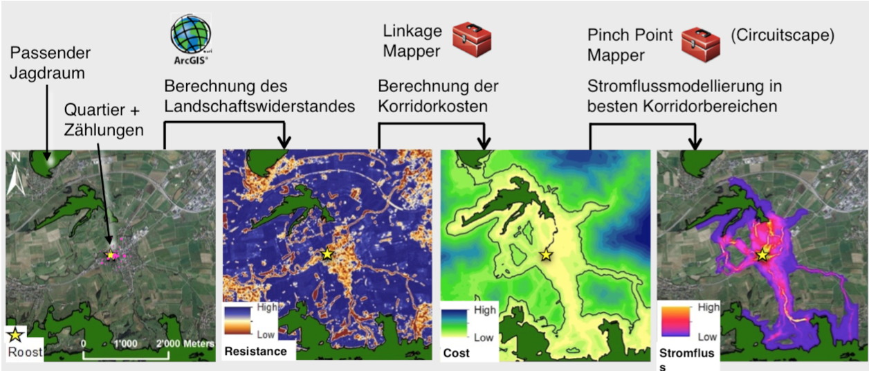In vier Modulen sollten Fledermaus-Flugkorridormodelle optimiert und validiert, für Prioritäre Fledermauskolonien schweizweit berechnet und schliesslich in ausgewählten Gemeinden deren Schutz umgesetzt werden. Ausserdem wird versucht, geeignete Jagdwälder von Grossen Mausohrfledermäusen zu modellieren.