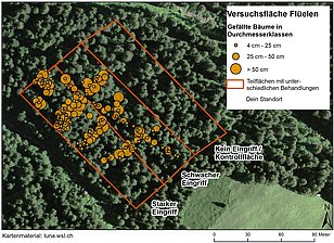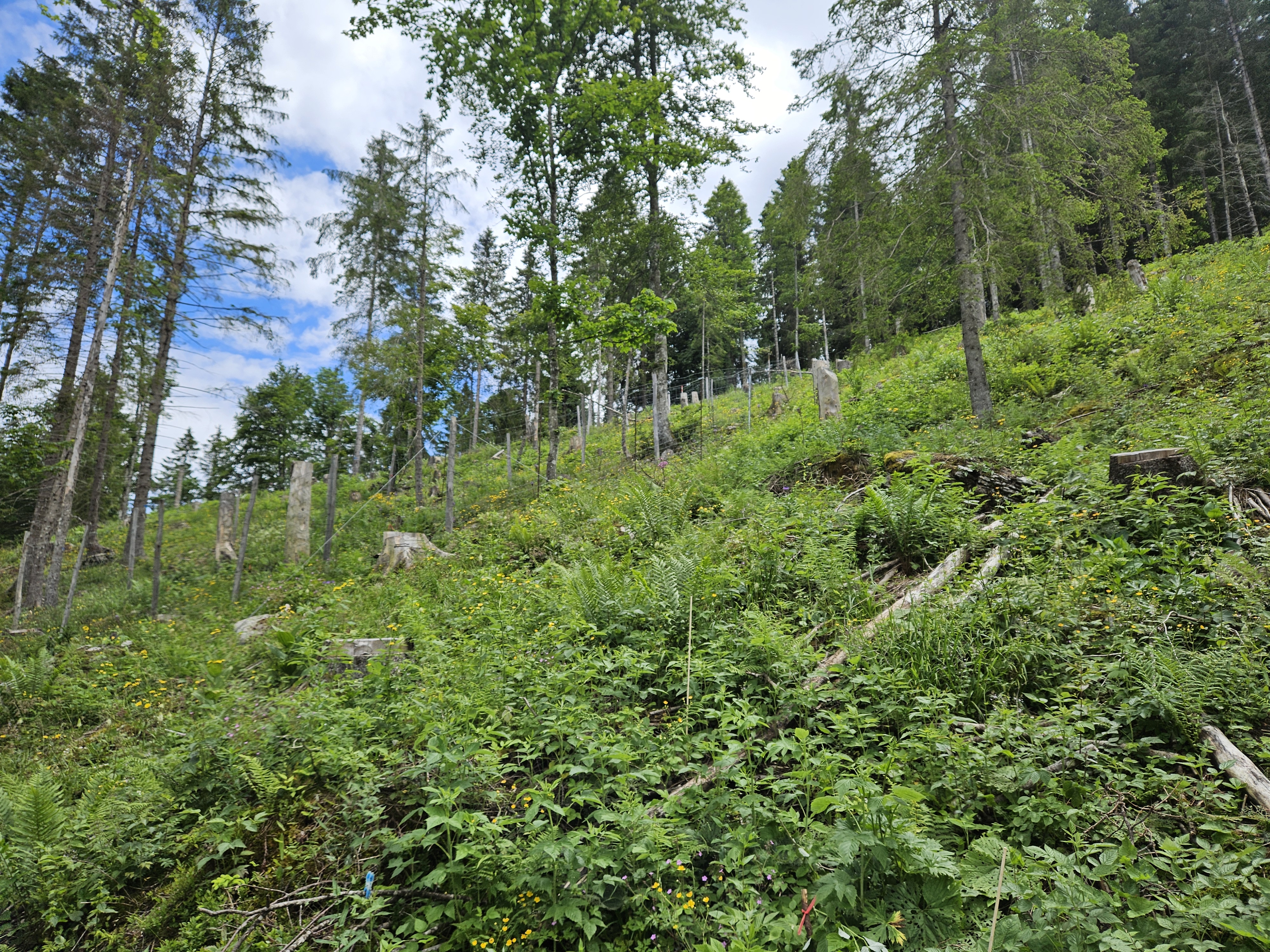 Die Inventur der Verjüngung nach dem waldbaulichen Eingriff (Eingriffsinventur) konnte im Sommer 2024 überall abgeschlossen werden. Hauptziel dieser Eingriffsinventur ist zu verstehen, wie hoch die Mortalität und die Schäden der Naturverjüngung infolge der Holzerei sind.