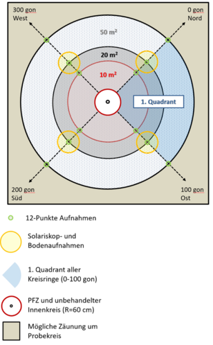 Die Verjüngungsprozesse werden in rund 500 Probeflächen (PF) untersucht, genauer in ca. 36-54 PF pro Versuchsfläche (VF). Eine PF ist in drei konzentrische Kreisringe aufgeteilt (Abbildung 5):
