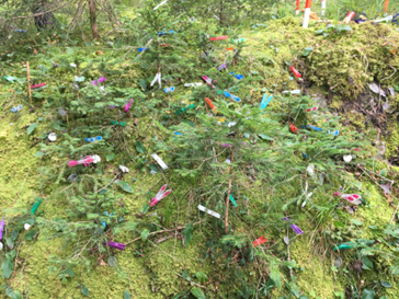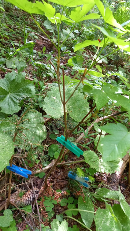 - Erfassung und Markierung von Verjüngungsindividuen, ihres Kleinstandorts und ihrer Entwicklung (Mortalität, Pflanzenhöhe) mit Fokus auf den 1. Quadrant;
