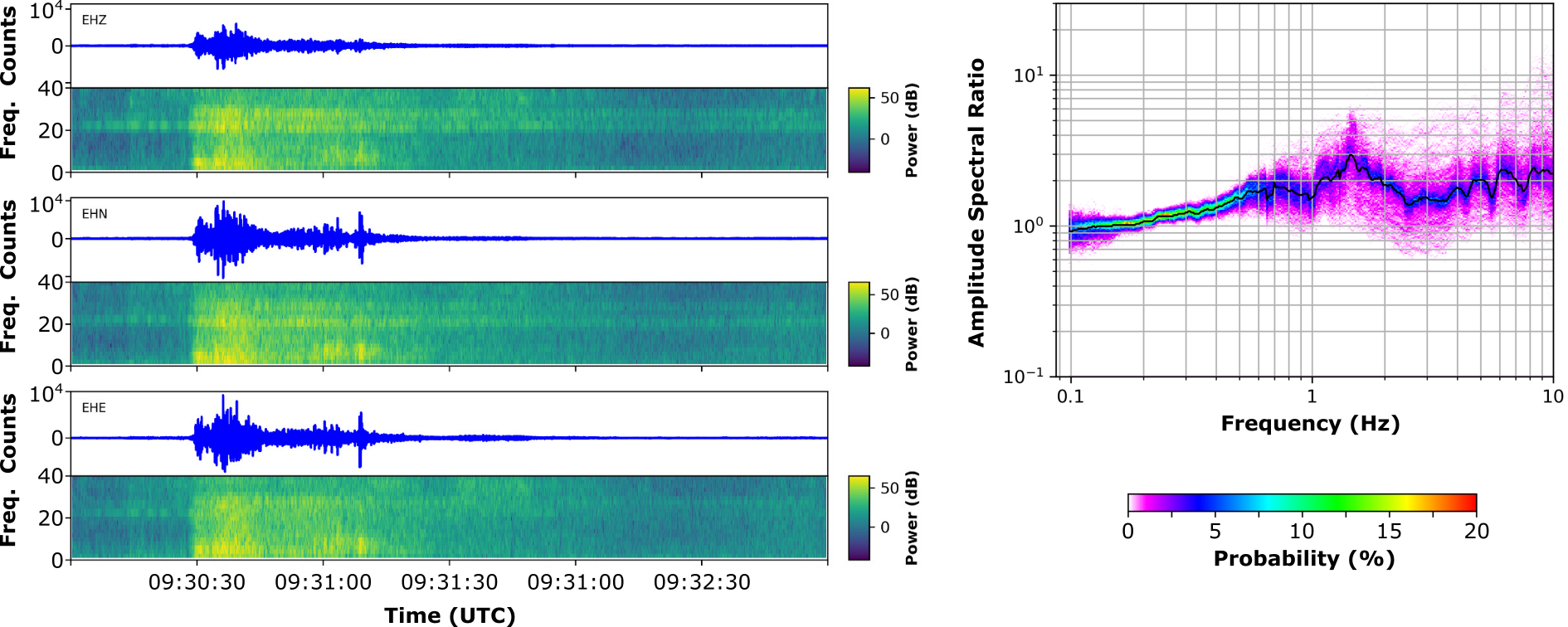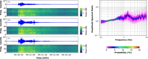 Seismic events were recorded throughout the year with a slightly increased rate from July to September. Although the origin of these seismic events can vary, the seismic response to an observed rockfall event is shown in Figure below. As an alternative and complementary analysis approach, the seismic ambient vibration technique provides information on the structural integrity of rock slopes. In the context of earthquake-induced damage or even earthquake-triggered rock slope failures, this approach enables the quantification of the seismic amplification due to site and topographic effects and can, in combination with data on environmental conditions, provide information about critical constellations (e.g., temperature, water availability by rain or snowmelt and earthquake).
