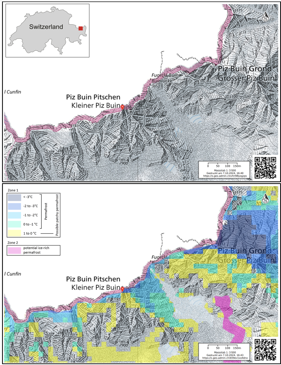 Areas at high elevations are sensitive to the warmer temperatures of the last years, in particular when the permafrost warms. Therefore, rockfalls, rockslides, debris flows and other gravitational mass movement processes are expected to increase in intensity and frequency. However, forecasting magnitude, location, and timing of catastrophic failure events is very difficult. Early identification and monitoring such slope processes is one of the research focuses of the newly created research center CERC (Climate Change, Extremes and Natural Hazards in Alpine Regions Research Centre) at SLF. Currently, CERC Scientists are monitoring an instability at the Piz Buin Pitschen, identified during a field inspection in July 2020. A strongly fractured and deformed rock mass with a crown fracture near the summit of Piz Buin Pitschen was observed. A possible release could cause potential hazards. Indeed, the popular alpinistic route to the Grossen Piz Buin (3’312 m a.s.l.) in the Silvretta Range starts on the Austrian side and leads over the Ochsentaler Glacier passing close to the Kleiner Piz Buin (Piz Buin Pitschen, 3’255 m a.sl.).