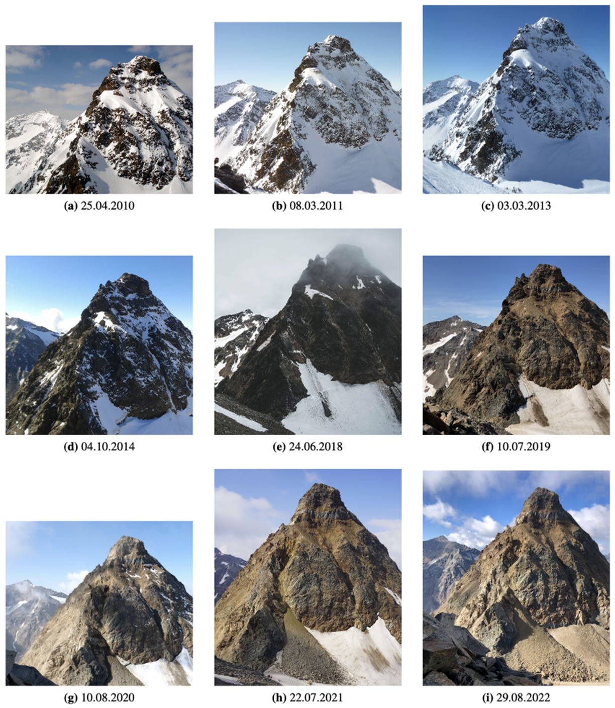 The Federal Office of Topography, swisstopo, in the framework of the project “SWISSIMAGE Journey through time” provides historical aerial photographs since 1946 and orthophotos since 1978. CERC scientists acquired and analyzed all the available aerial photos to identify changes on the Piz Buin Pitschen. Initial changes can be seen already in 2005, with an increase of rock fall deposits beneath the northern rock face. The accumulation of debris material in the gully Fuorcla Buin can already be detected in the orthophotos acquired in 2008. In addition to the aerial photos, due to the prominence of the route to Piz Buin numerous pictures and videos can be found in the internet and social media, showing insights into different conditions of the rock mass at different times. These pictures show a strong increase in accumulation in 2019, associated with major rockfall activity.