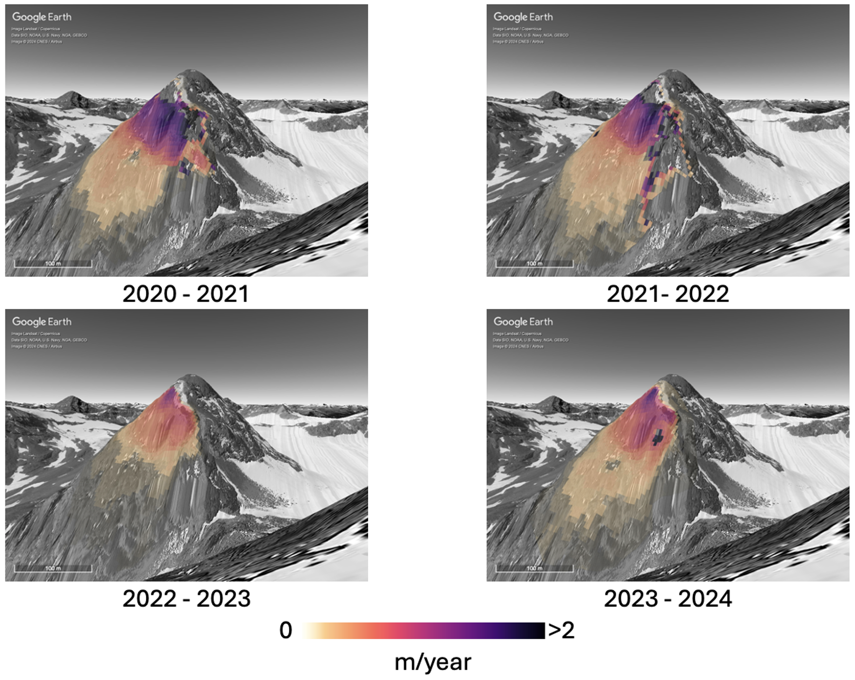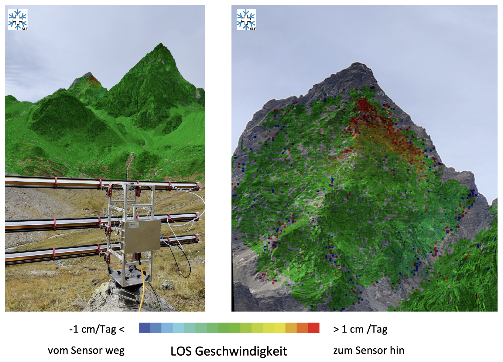 On September 13, 2022, in collaboration with GAMMA Remote Sensing AG, a measurement campaign was carried out above Chamonna Tuoi Hutte with a ground-based radar (GAMMA Portable Radar Interferometer, GPRI). Radar images were taken every ca. 5 minutes between September 13, 2:30 p.m. and September 14, 9.00 a.m. on, for a total of 448 acquisitions. These measurements confirm the results obtained with the drone-based surveys, showing velocities up to 1 cm/day in the upper portions of the slope.
