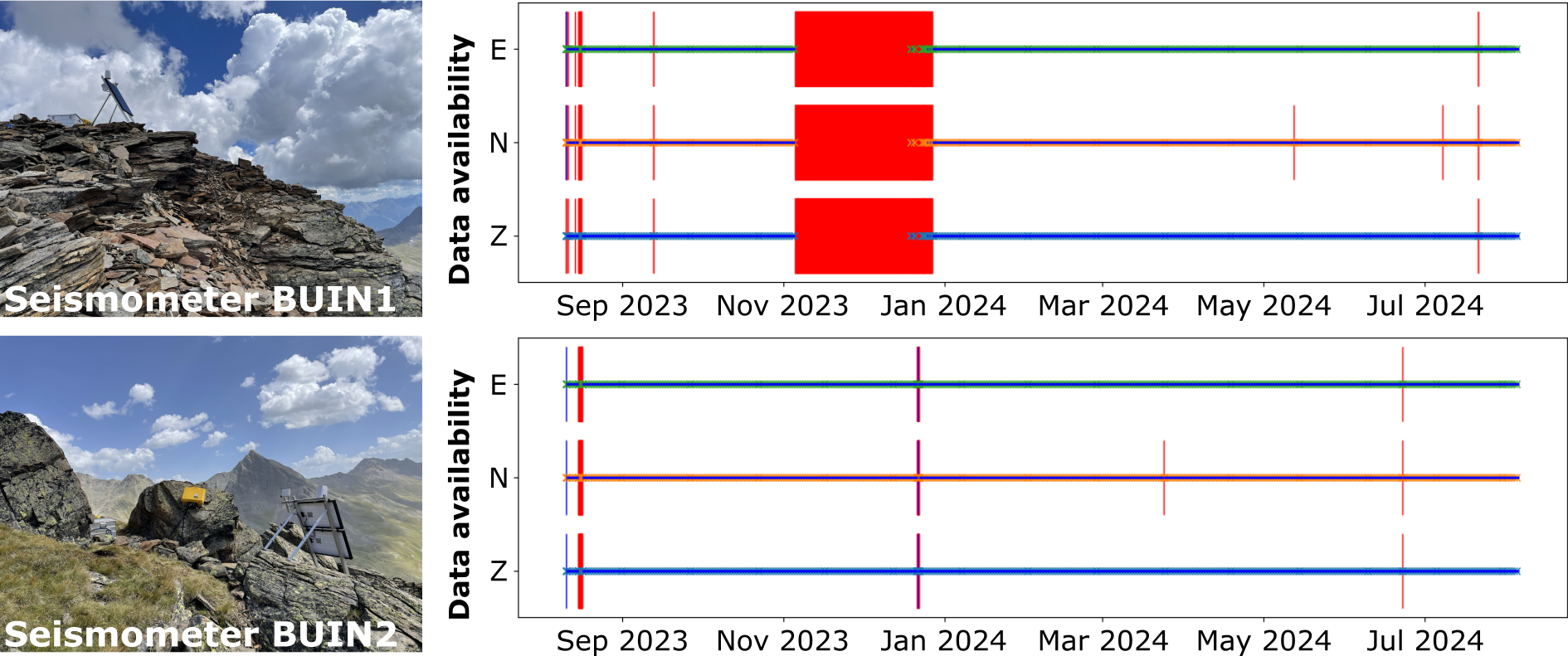In August 2023, we deployed two seismometer stations to complement yearly remote sensing observations with continuous in-situ measurements. These data allow, on the one hand, the detection and characterization of rockfall events throughout the year and, on the other hand, the analysis of ambient seismic vibrations that arise from natural sources such as the world’s oceans, earthquakes, or water fluxes but also from human activity.