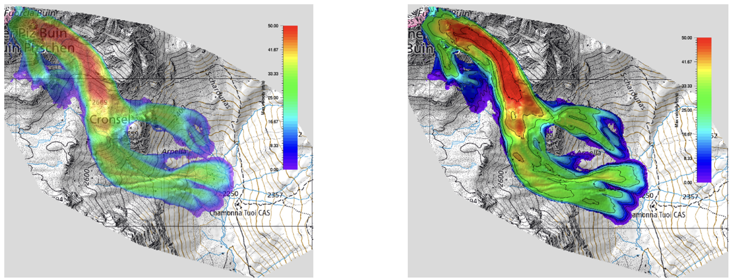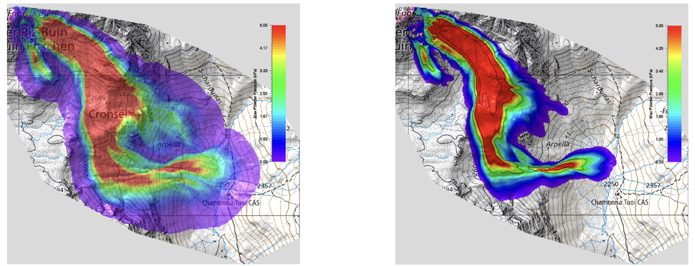 After evaluation of the DEMs, orthophotos, and structural setting of the rock mass, geologic modeling was performed to provide estimates of the possible release volume in case of slope failure. Simulations with these volumes were performed using RAMMS (Rapid Mass Movement Simulation), to gain first insights on the hazard potential. The calculations were carried out using the newly developed rock/ice module, allowing for the simulation of mixed flow forms (rock/ice/snow), thus estimating the influence during the event of any free water that may be present. Different failure scenarios were computed, such as mass release in winter conditions, i.e., with the presence and entrainment of snow, or in the summer season, i.e., with saturated or dry conditions of the entrainment zone. Moreover, the powder cloud and associated pressures generated by the modeled slope failures have been computed in all cases. If the rock avalanche is able to overflow the terrace at Cronsel, there is considerable danger from the dust cloud. Computed pressures of the dust in the vicinity of the hut is up to 3kPa. Similar pressures were caused in the past injuries to people in high mountain regions. Moreover, it must be assumed that the dust cloud carries smaller stones at high speed and could damage the hut and potentially also kill people.